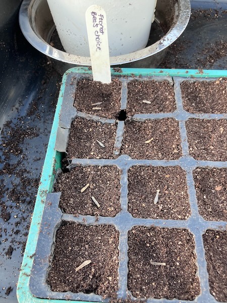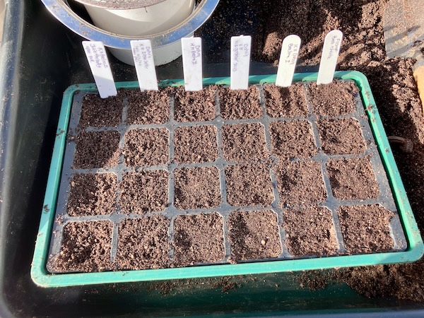 At the end of August, once I was able to garden again after my second cataract surgery, I sowed my dahlia seeds into two covered seed trays, and sprinkled them with enough seed raising mix to cover them.