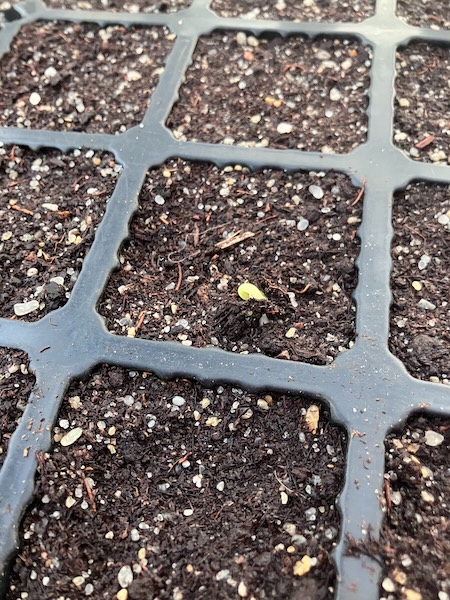 With them watered, and kept moist in the trays, the dahlia seeds stayed in our dining room in the warmth while they germinated. To my surprise, most of the dahlia seeds I planted germinated, at a rate of about 95%, which is way more dahlias than I expected to plant in my garden this year.