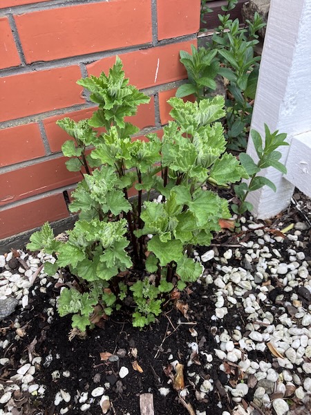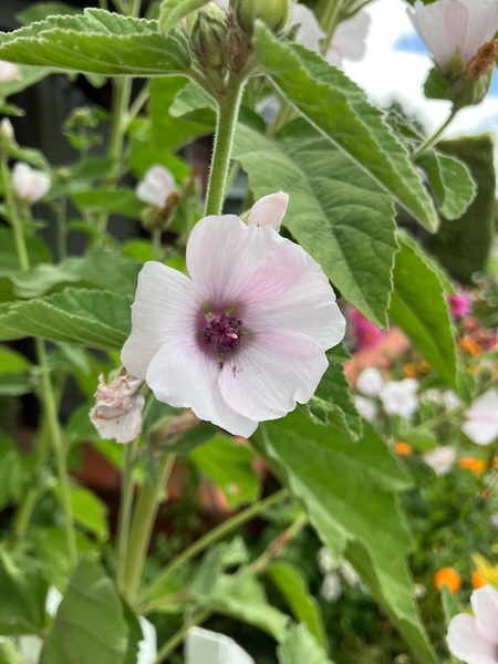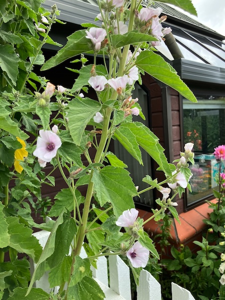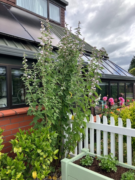 And finally there is my Marshmallow plant, Althea officinalis, which is the ancient source of making the marshmallow confectionery we know today. The marshmallow plant is a perennial which dies back each year over winter, and it grows again to a height of over 1.8 meters in summer, producing long stalks of white and pink flowers (which is where the marshmallow confectionery these days get their colours from). All parts of the marshmallow plant have medicinal uses, and its dried root is the original source of mucus for making marshmallow sweets.