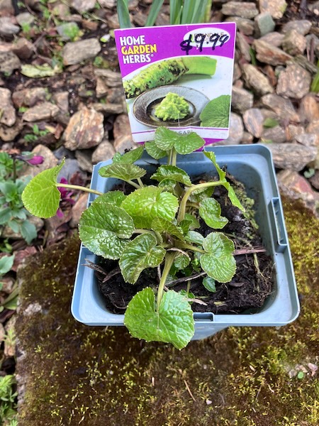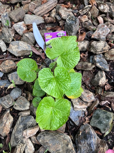 Next up is the Wasabi plant I recently bought from my local garden center. The plan is to grow my Wasabi plant for three years, and then harvest the root so I can make my own Wasabi for eating with sushi. Wasabi requires full shade and damp conditions, and I have the perfect spot in my garden to give it a home. It is sensitive to frost, so I've been spraying the leaves with liquid frost cloth this Spring for frost protection. It has only been growing for about a month, and it's already growing strong in its shady spot.