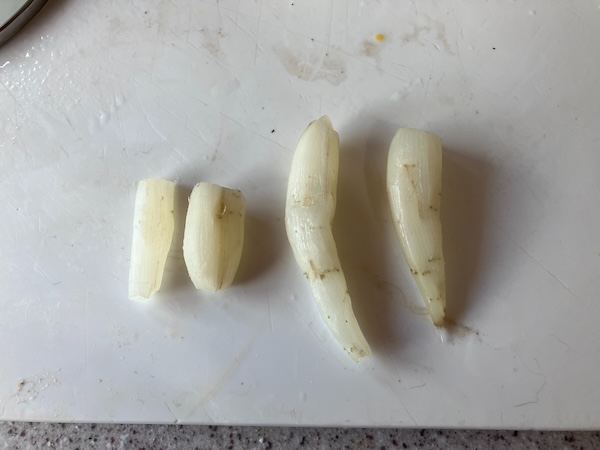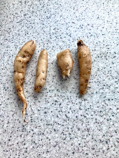 I dug the dahlia out of the ground, removed the stems and leaves, and then washed out as much dirt as possible from the tubers and roots. After bringing the root system of the dahlia into our kitchen, I cut off the small tubers the dahlia seedling had begun to grow. Small dahlia tubers we thought would be less fibrous, and more easy to cook with, compared to older and bigger tubers.