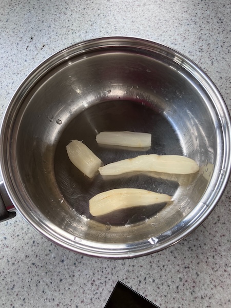 After giving the tubers another wash to remove all the dirt, I peeled the dahlia tubers as was suggested on the internet by other sources. With them now clean, I put the tubers into a small pot containing water, and added a bit of salt (similar to when boiling potatoes).