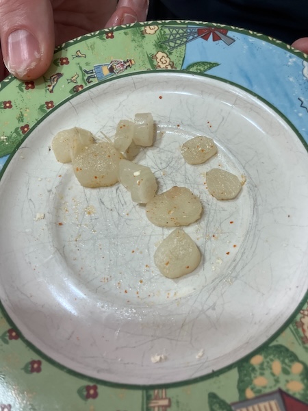 We brought the pot of water up to a boil, and let the dahlia tubers simmer for 10 minutes. At that point we tested the tubers with a knife and found them to be al dente, which was what my research suggested meant that the dahlia tubers were ready for eating. We cut one of the dahlia tubers up into thin slices and ate the slice plain...